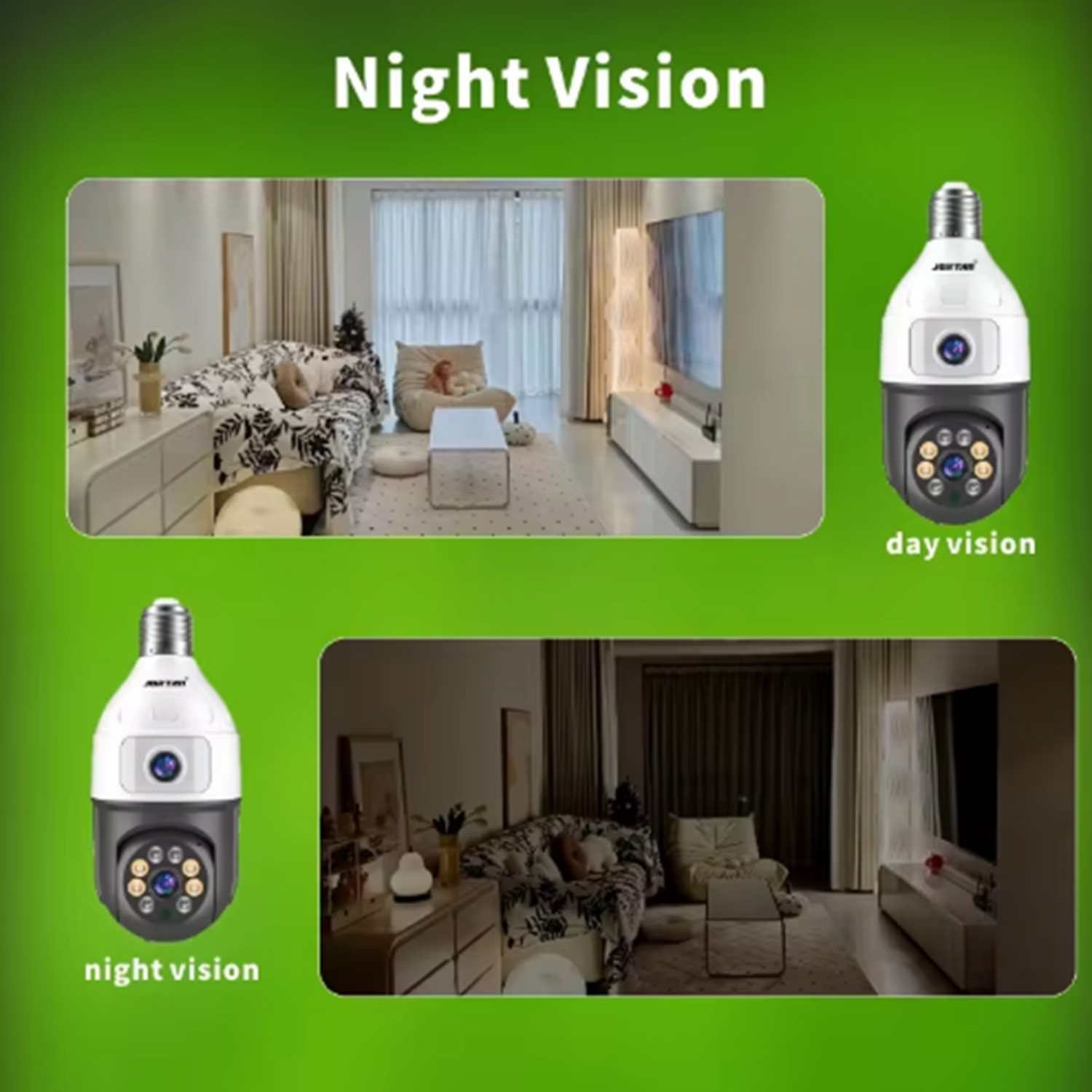 Este dotata cu doua camere 2MP una fixa, iar cealaltă mobila și poate fi montata în locuri pentru becuri ce se conectează la fasung E27.